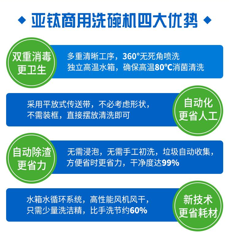 亞鈦洗碗機本機全程引進德國技術。主要部件均采用進口品牌元器件。強水壓,大流量,確保了最佳的洗滌效果,自動控制部分由微電腦控制系統和專業設計制作的全新操作面板實現最舒適的操作體驗,可以滿足各類符合規格要求的盤碟碗以及玻璃杯的高標準洗滌要求:經國家衛生部門和質量安全機構檢測,清洗出餐具衛生效果達到國家衛生標準和國家質量安全標準。